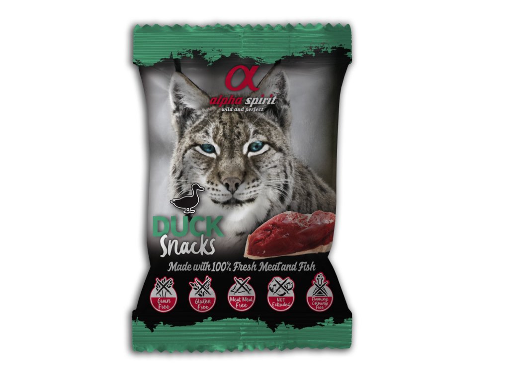 Snacks Alpha Spirit s čerstvým kachním a kuřecím masem a čerstvou celou rybou, potřebným Taurinem a dalšími přírodními ingrediencemi. Odměňte vaší kočku a vzbuďte v ní vzpomínky na divočinu.