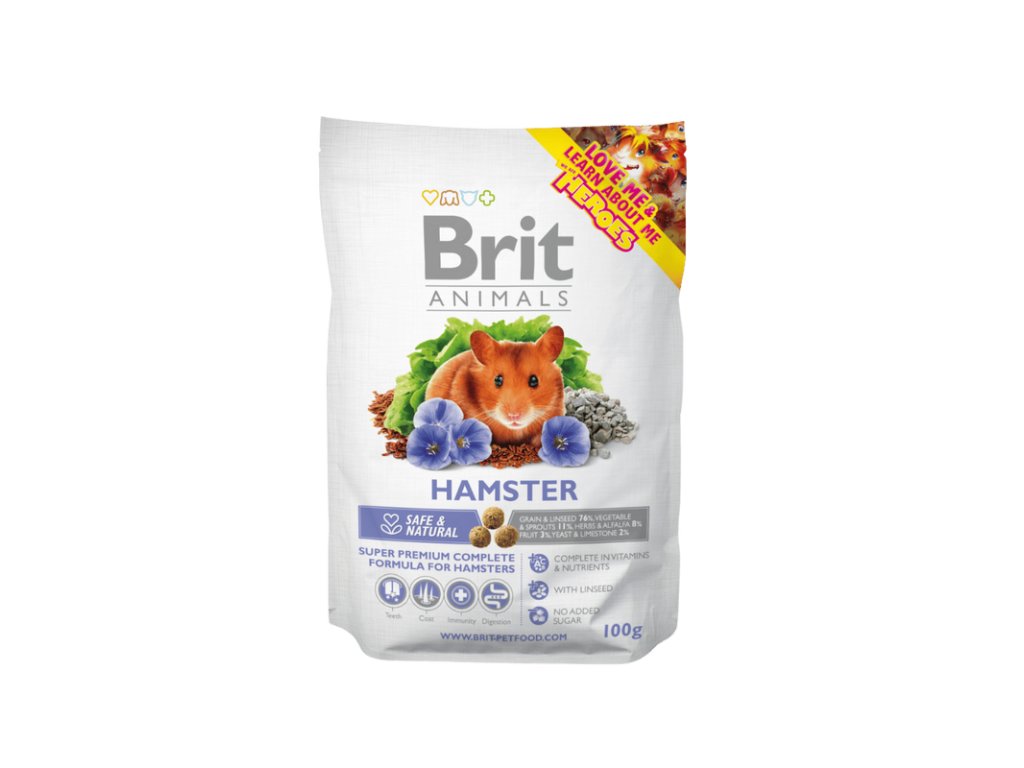 Brit Animals Křeček – Kompletní krmivo 100 g – superprémiové kompletní krmivo bez přidaného cukru, obohacené o lněné semínko, vitamíny a byliny pro podporu zdraví srsti, trávení a celkovou vitalitu křečků.