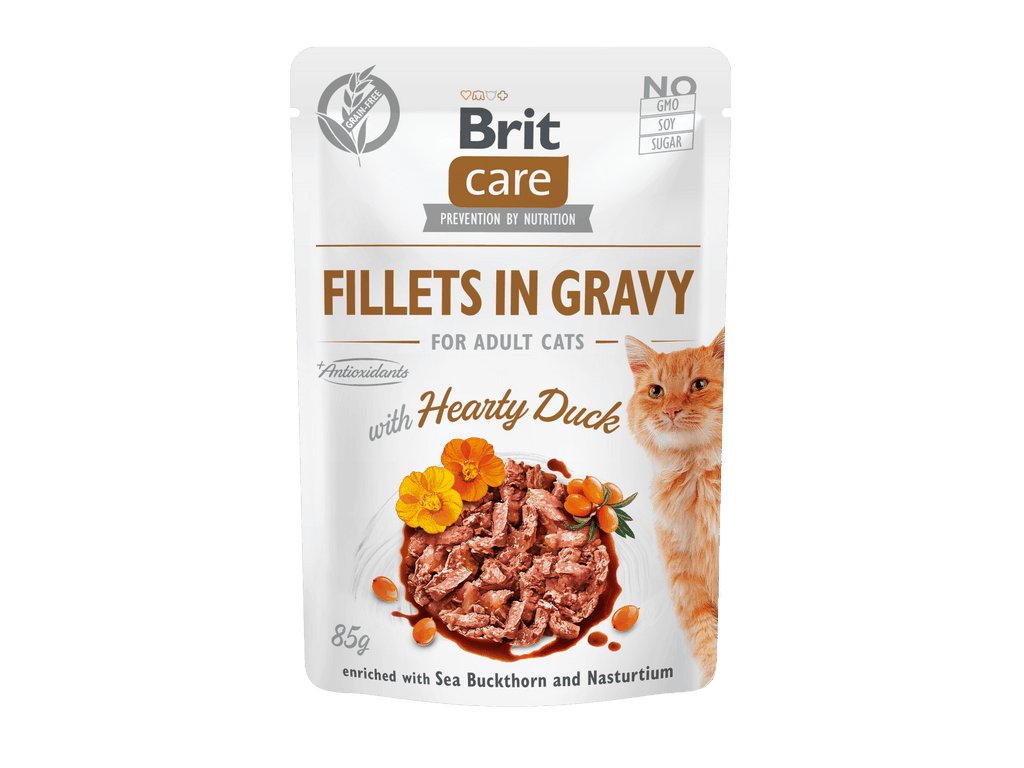 Brit Care Kočka Filety v omáčce s kachnou 85 g – kvalitní kapsička bez obilovin s kachním masem ve šťavnaté omáčce; doplněná o rakytník a lichořeřišnici, které přispívají ke zdraví močových cest a imunity. Kompletní superprémiové krmivo pro dospělé kočky.
