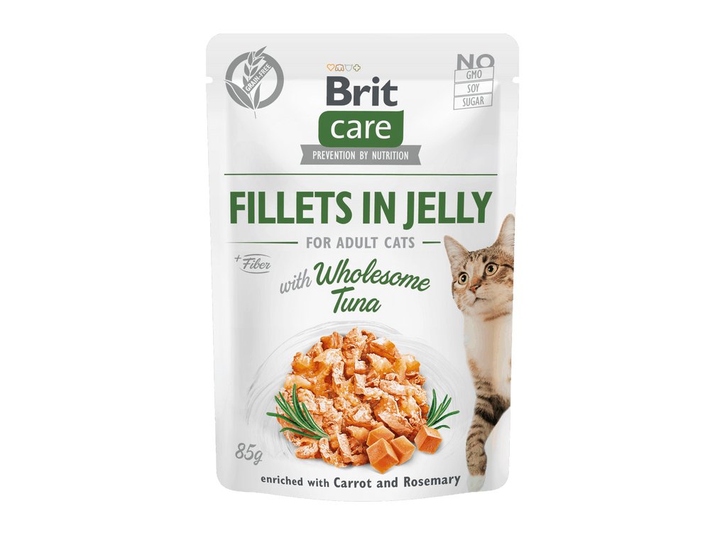 Brit Care Kočka Filety v želé Tuňák 85 g – kvalitní kapsička bez obilovin s masovou směsí kuřete, jater a jemného tuňáka; doplněná o mrkev a rozmarýn pro podporu zdravého trávení. Kompletní superprémiové krmivo pro dospělé kočky.