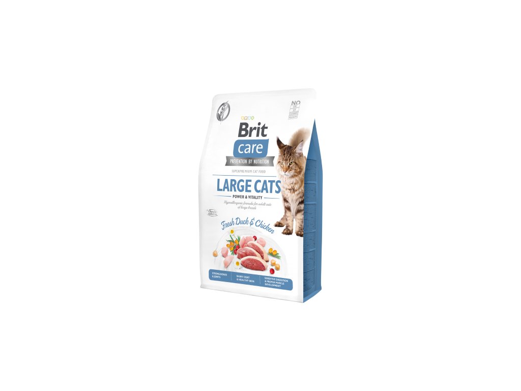 Brit Care Cat Grain-Free Large cats Power & Vitality, 2 kg – kompletní superprémiové suché krmivo bez obilovin pro dospělé kočky velkých plemen; obsahuje čerstvé maso z kachny a kuřete a je bohaté na bílkoviny a živiny pro podporu svalstva, kloubů a lesklé srsti.