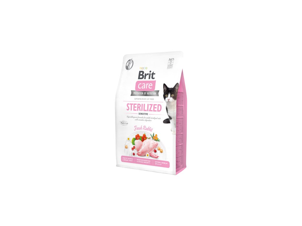 Brit Care Cat Grain-Free Sterilized Sensitive, 2 kg – kvalitní suché krmivo bez obilovin pro dospělé sterilizované kočky s citlivým trávením; hypoalergenní receptura s čerstvým králičím masem, rakytníkem a lichořeřišnicí podporuje zdraví močových cest, jemné trávení a silnou imunitu. Kompletní superprémiové krmivo.