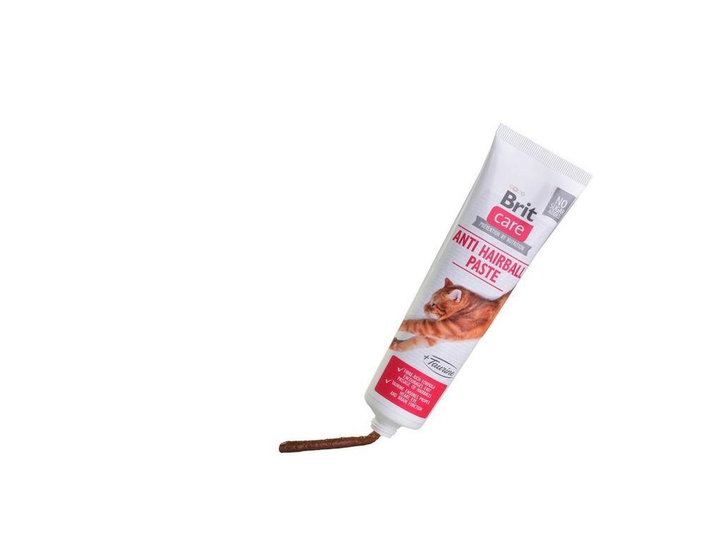 Brit Care Pasta proti chlupovým bezoárům s taurinom 100 g – kvalitní funkční pasta bohatá na vlákninu, určená pro dospělé kočky, zejména dlouhosrsté; pomáhá usnadnit průchod spolknutých chlupů trávicím traktem a podporuje správnou funkci srdce, očí a mozku díky obsahu taurinu. Doplněk stravy, bez přidaného cukru, umělých příchutí a konzervantů.