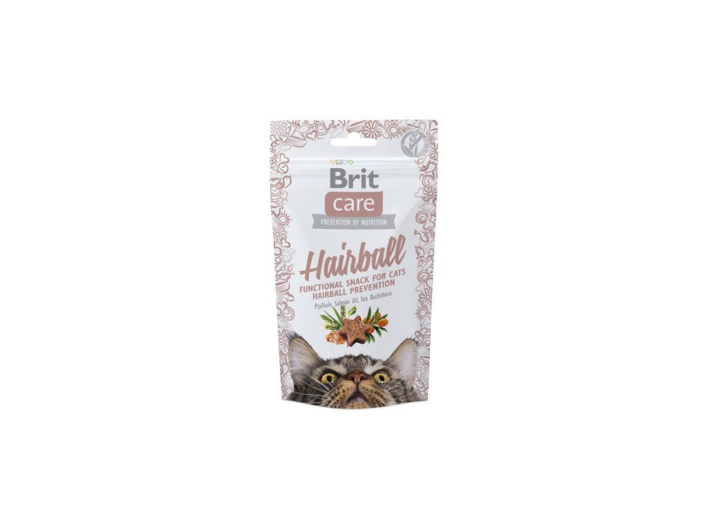 Brit Care Snack proti chlupovým bezoárům 50 g – poloměkký funkční pamlsek bez obilovin s chutí kachního masa; obsahuje psyllium, lososový olej, lignocelulózu a rakytník pro snadné vyplavování spolknutých chlupů. Komplementární potravina pro dospělé kočky.