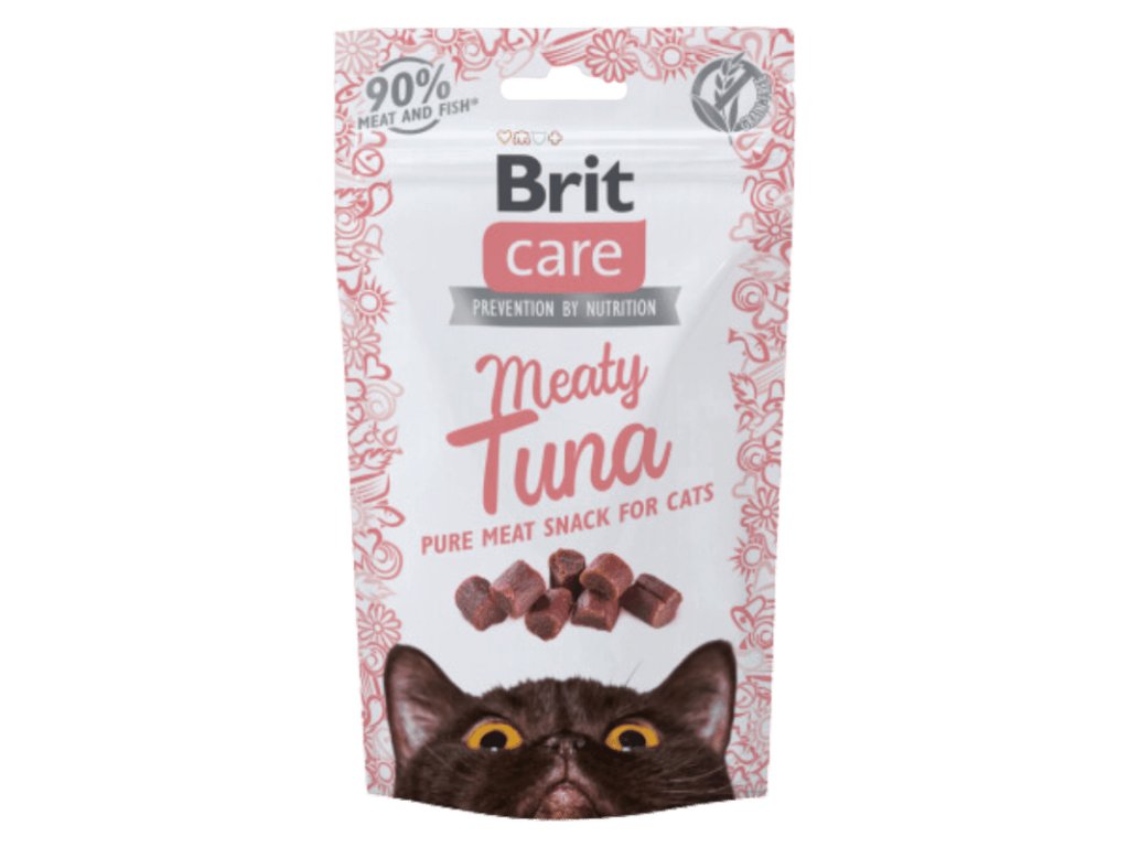 Brit Care Cat Snack Meaty Tuna 50 g – poloměkký snack bez obilovin s vysokým podílem tuňáka, ideální jako chutná odměna pro dospělé kočky.