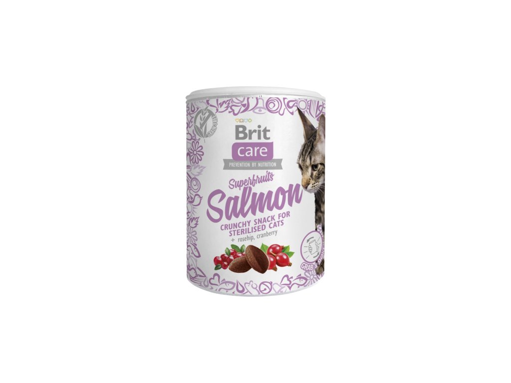 Brit Care Cat Snack Superfruits Salmon 100 g – chutný bezobilný křupavý snack s vysokým podílem lososa a superpotravinami, určený pro podporu zdravé srsti, imunitního systému a trávení u dospělých i sterilizovaných koček.