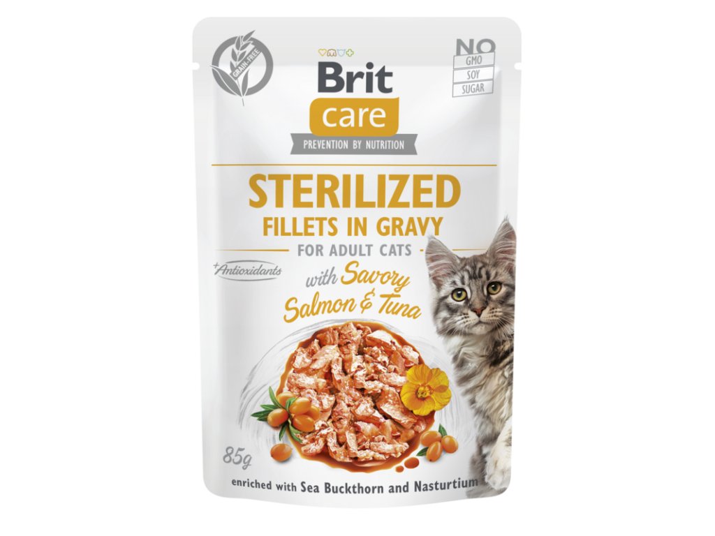 Brit Care Cat Sterilized. Fillets in Gravy with Savory Salmon & Tuna 85 g – superprémiová kapsička bez obilovin, s jemnými filety pro kastrované kočky, zaměřená na podporu zdravých močových cest, imunitu a optimální tělesnou hmotnost. Kompletní krmivo pro sterilizované dospělé kočky.