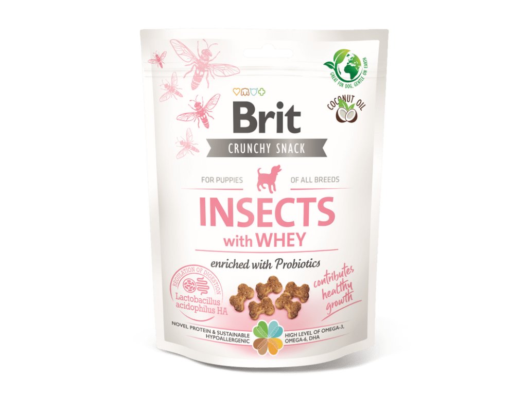 Brit Care Bezobilné pamlsky pro štěňata – Hmyz se syrovátkou a probiotiky - Chutné a zdravé křupavé sušenky bez obilovin s hmyzem, syrovátkou a přídavkem probiotik. Ideální pro štěňata všech plemen – podporují zdravé trávení, imunitu i správný růst.
