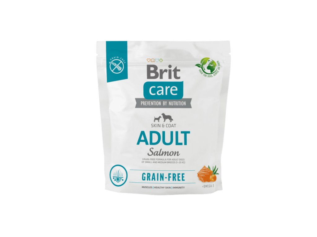 Brit Care Dog Grain-free Adult, 1 kg – Brit Care bezobilné granule pro dospělé psy středních plemen – superprémiové krmivo bez obilovin s kvalitním lososem pro podporu silné imunity, zdravého trávení a lesklé srsti.