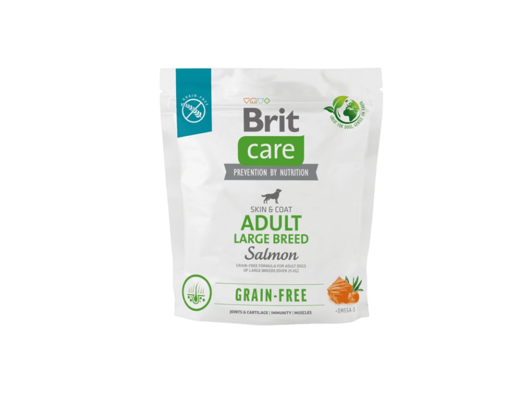 Brit Care Dog Grain-free Adult Large Breed, 1 kg – Brit Care bezobilné granule pro dospělé psy velkých plemen – superprémiové krmivo s vysokým podílem lososa a funkčními ingrediencemi pro zdravé klouby, silnou imunitu a perfektní kondici velkých plemen.
