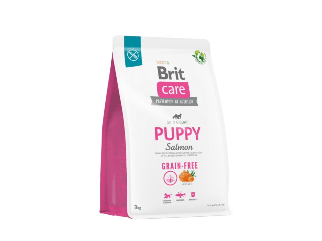 Brit Care Dog Grain-free Puppy, 3 kg – Brit Care bezobilné granule pro štěňata – superprémiové krmivo bez obilovin s lososem a bramborami, navržené pro zdravý růst, silnou imunitu a optimální vývoj štěňat všech plemen.