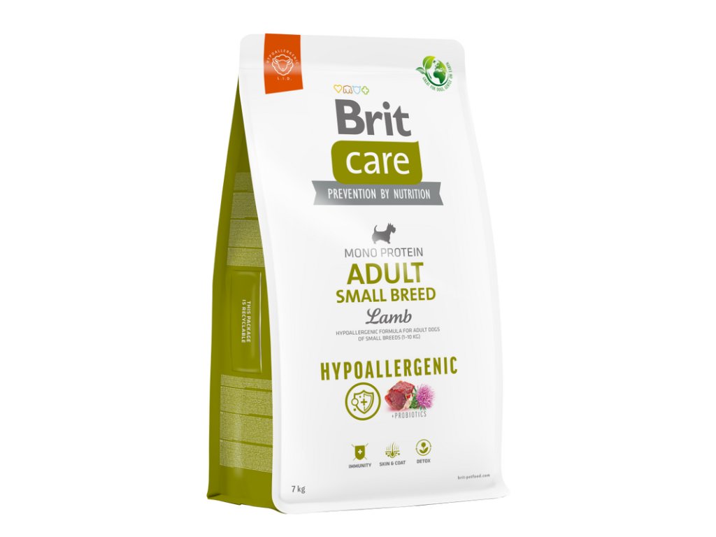 Brit Care Dog Hypoallergenic Adult Small Breed, 7 kg – Brit Care bezobilné granule pro dospělé psy malých plemen – Hypoallergenic – superprémiové monoproteinové granule určené pro psy s citlivým zažíváním a alergiemi, podporují zdraví střev, jater i kloubů.