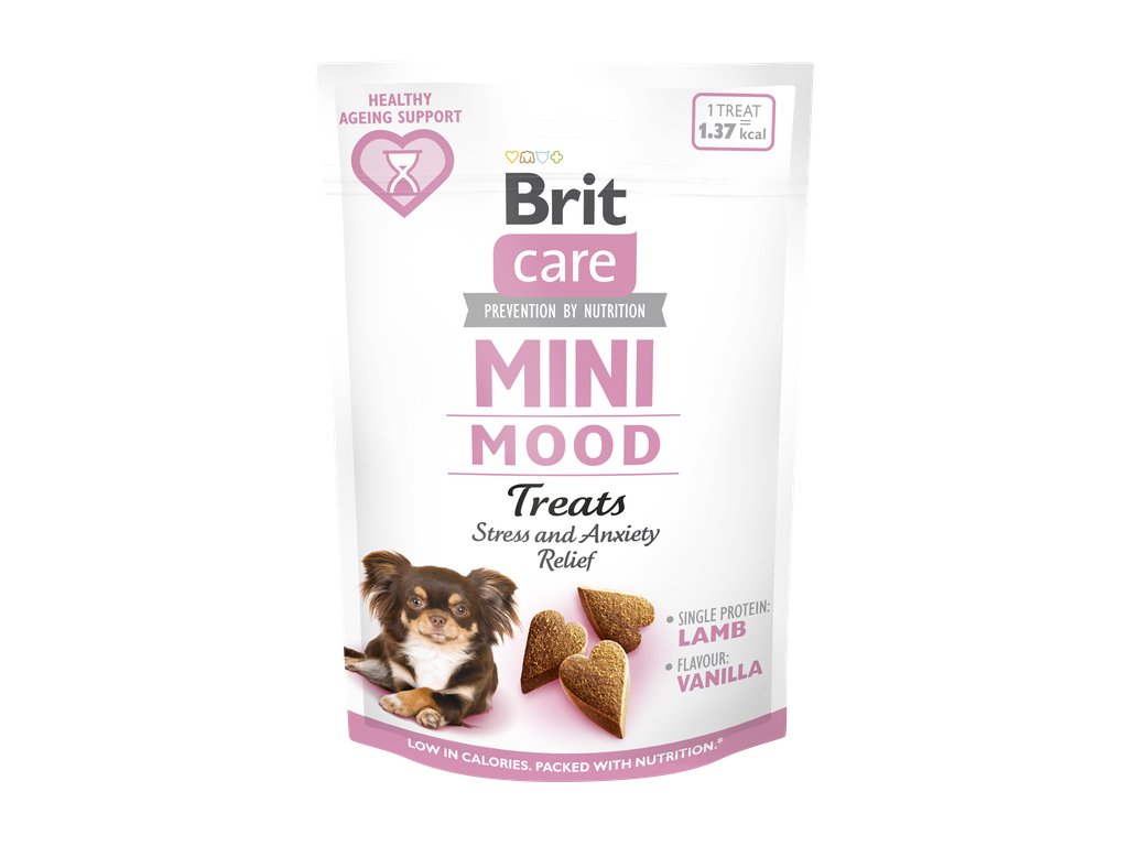 Brit Care Mini pamlsky – Mood - Mini pamlsky s meduňkou a heřmánkem pro zklidnění, emoční rovnováhu a pohodu malých psů. Vhodné při stresu, změnách prostředí, návštěvě veterináře nebo jako každodenní podpora duševní rovnováhy.