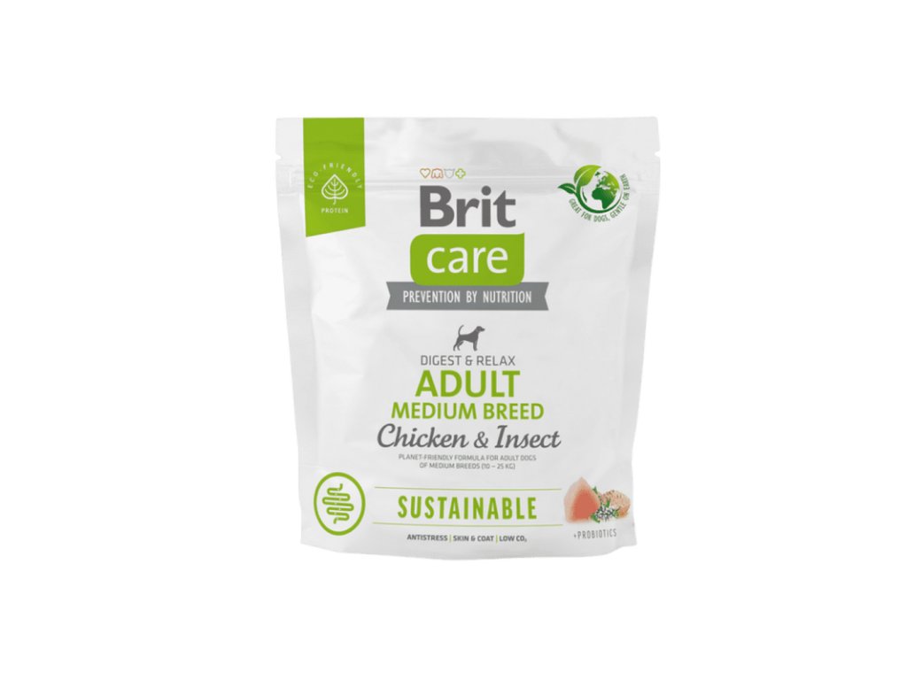 Brit Care Dog Sustainable Adult Medium Breed, 1 kg – Brit Care bezobilné granule pro dospělé psy středních plemen – superprémiová ekologická receptura bez obilovin, navržená pro aktivní psy středních plemen; podporuje svalový tonus, klouby, imunitu, a zároveň minimalizuje ekologickou stopu.