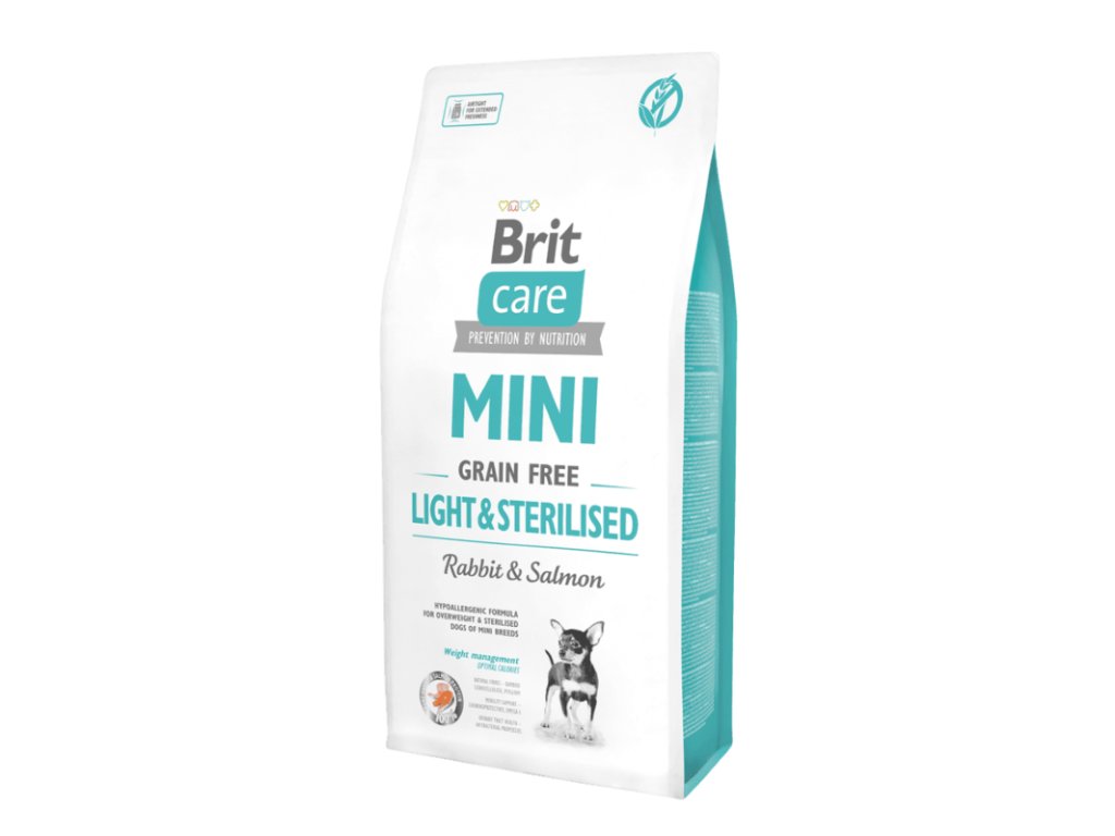 Brit Care Mini Grain Free Light & Sterilised 7kg – Brit Care bezobilné granule pro malé psy – hypoalergenní superprémiová receptura bez obilovin, speciálně vytvořená pro malé psy po sterilizaci i s nadváhou, podporuje zdravou váhu, trávení a srst.