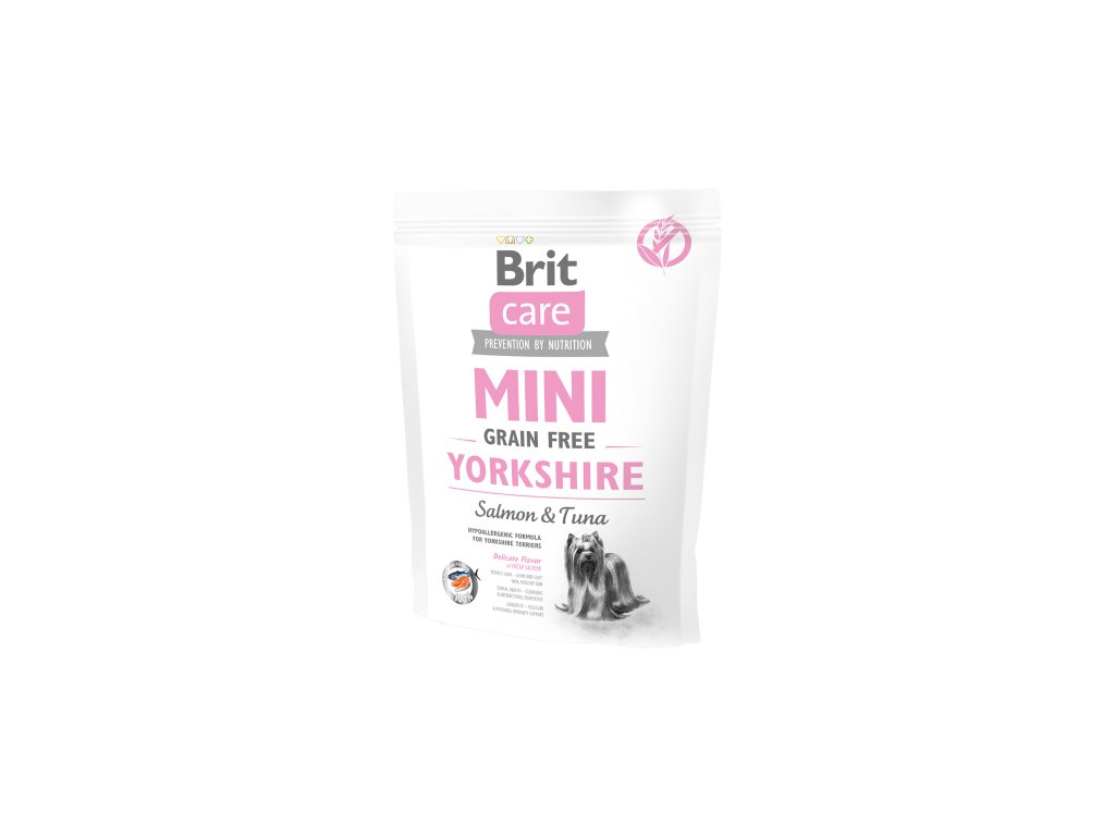 Brit Care Mini Grain Free Yorkshire 0,4kg – Brit Care bezobilné granule pro dospělé psy malých plemen – superprémiová hypoalergenní receptura bez obilovin, speciálně navržená pro jorkšírské teriéry a další miniaturní psy; podporuje zdravou kůži, lesklou srst, klouby, trávení a celkovou vitalitu.