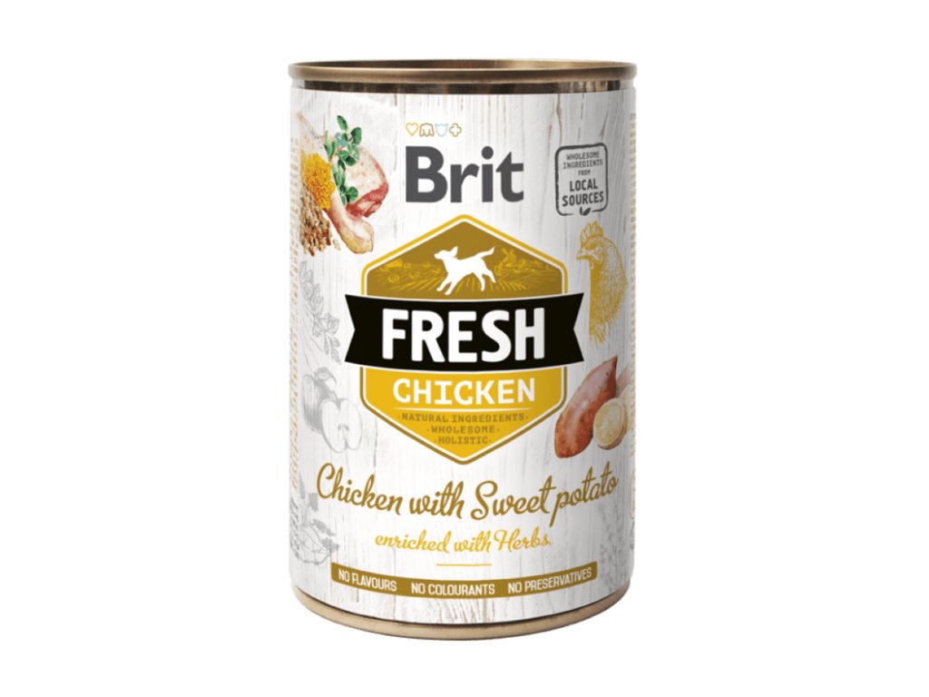 Brit Fresh kuře se sladkými bramborami - Kompletní konzerva z čerstvého kuřecího masa a 4 % sladkých brambor, připravená metodou šetrného vaření v páře. Bez obilovin, lepku, sóji a umělých konzervantů – ideální i pro psy s citlivým zažíváním.