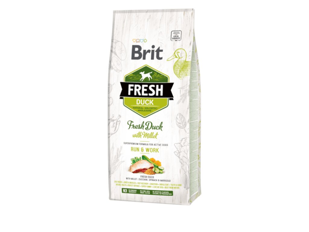 Brit Fresh Duck with Millet Active Run & Work 12 kg – Brit Fresh bezobilné granule pro aktivní dospělé psy – Kachna & Proso – holistická superprémiová receptura s vysokým podílem čerstvého kachního masa a funkčními složkami, vyvinutá pro podporu výdrže, svalové regenerace, kloubů a vitality.