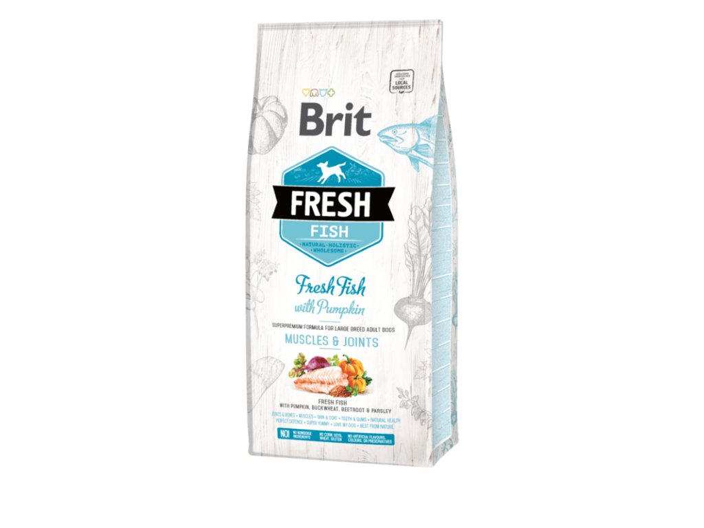 Brit Fresh Fish with Pumpkin Adult Large 12 kg – Brit Fresh bezobilné granule pro dospělé psy velkých plemen – holistická superprémiová receptura s čerstvým rybím masem, navržená pro podporu svalové síly, kloubů, trávení a celkové vitality aktivních velkých psů.