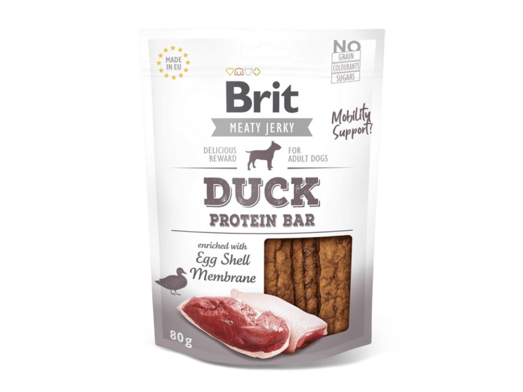 Brit Jerky kachní proteinová tyčinka - Chutná a měkká tyčinka z 85 % kachního masa – ideální jako odměna nebo doplněk výživy. Bez obilovin, sóji a chemických konzervantů. Vhodná i pro psy s citlivým zažíváním.
