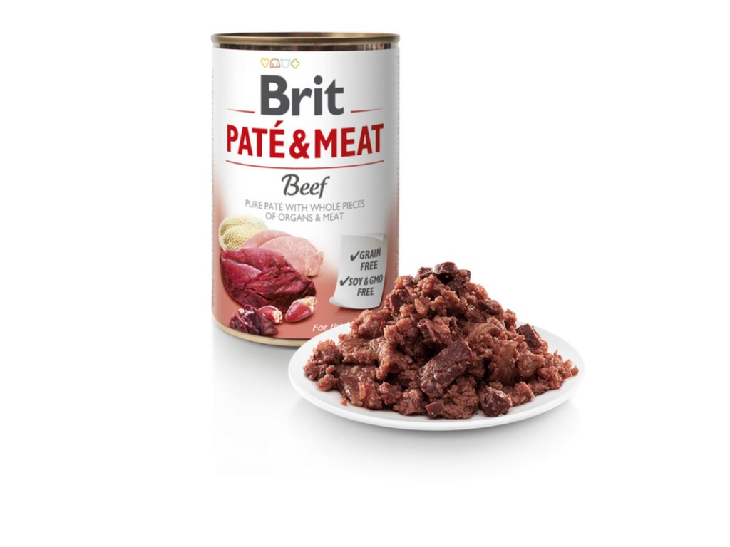Brit Paté & Meat hovězí - Kompletní masová konzerva s vysokým obsahem masa a kousky hovězího – vyrobená bez obilovin, sóji a geneticky modifikovaných surovin. Vhodná pro každodenní krmení i jako doplněk k suchému krmivu.
