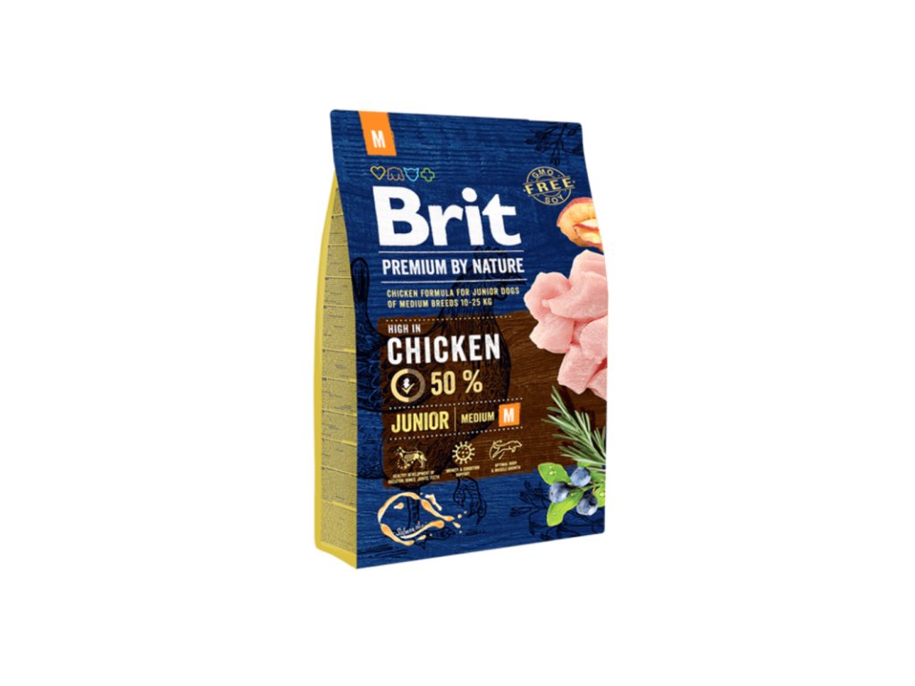 Brit Premium by Nature Junior M 3 kg – Brit Premium by Nature bezobilné granule pro mladé psy středních plemen – Kuřecí – holistická superprémiová receptura určená pro štěňata 1–12 měsíců, která zaručuje optimální růst, správný vývoj kloubů, zubů i trávení.