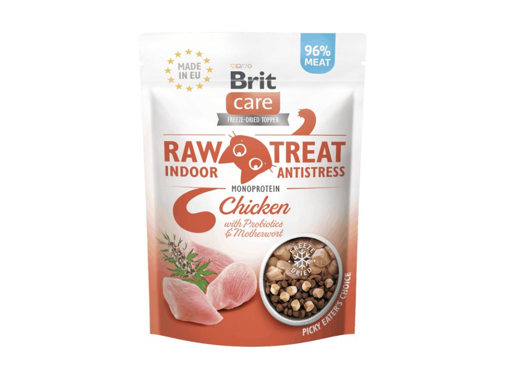 Brit RAW Treat Cat Indoor&Antistress, 40 g - Zamraženě sušený pamlsek navržený pro omezení stresu a podporu pohody u domácích koček. Přírodní kombinace s exkluzivní chutí i funkčními látkami.