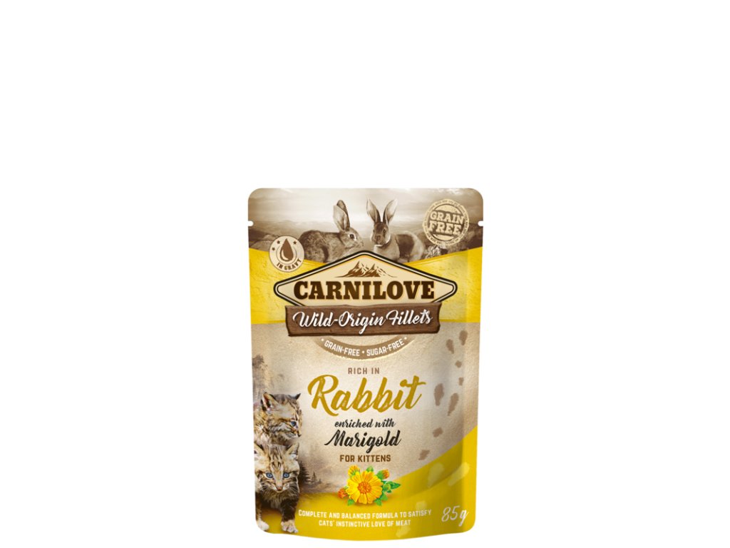 Carnilove Cat Pouch Rich in Rabbit Enriched with Marigold - Jemné filety z králíka obohacené měsíčkem lékařským – podpora trávení a imunity.