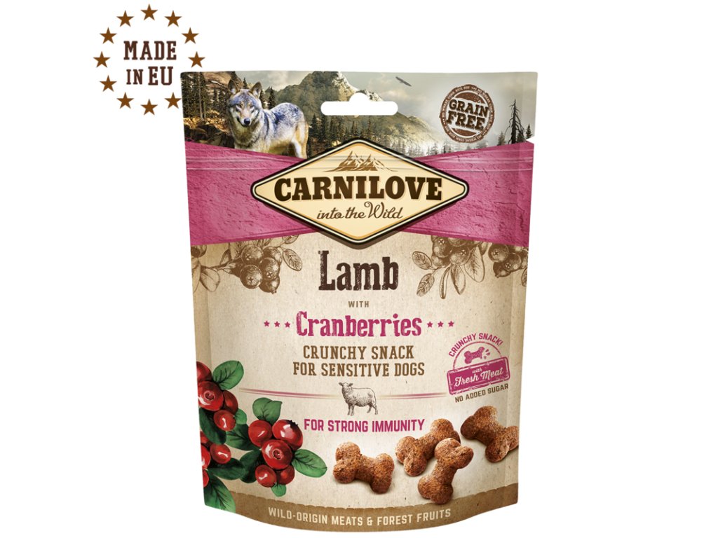 Carnilove Dog Crunchy Snack Lamb with Cranberries with fresh meat - Grain‑free křupavý pamlsek s vysokým podílem masa (50 %) vhodný i pro citlivé psy. Brusinky jako přírodní antioxidanty podporují imunitu.