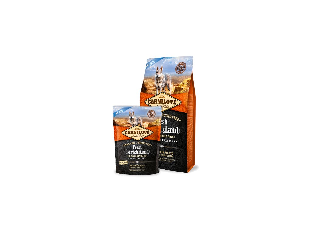 Carnilove Dog Fresh Ostrich & Lamb for small breed - Hypoalergenní granule určené pro malé psy, kombinující pštrosí a jehněčí maso s vysokým podílem bílkovin a doplňkovými složkami pro zdraví pokožky, imunity a kloubů.