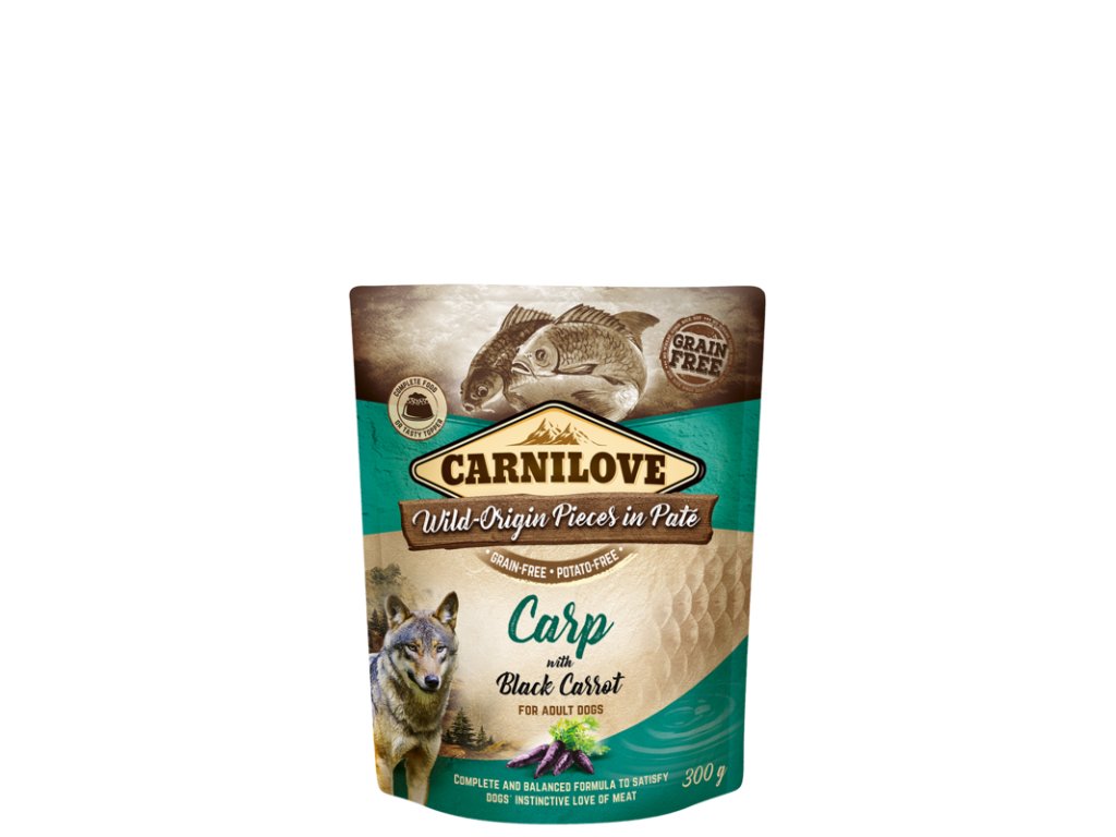 Carnilove Dog Pouch Paté Carp with Black Carrot - Superprémiová paštika s 85 % masa a vnitřností (59 % krůta, 26 % kapr), doplněná černou mrkví pro podporu srdce.