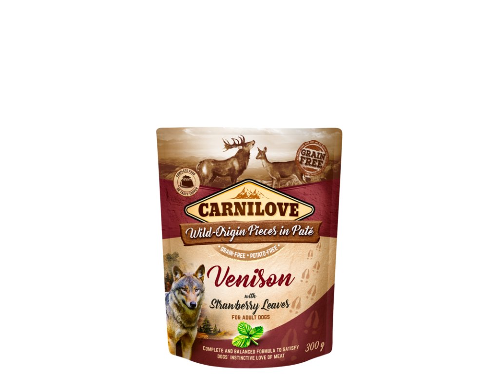 Carnilove Dog Pouch Paté Venison with Strawberry Leaves - Divoká paštika ze zvěřiny doplněná o listy jahodníku. Chutná a přirozená výživa.