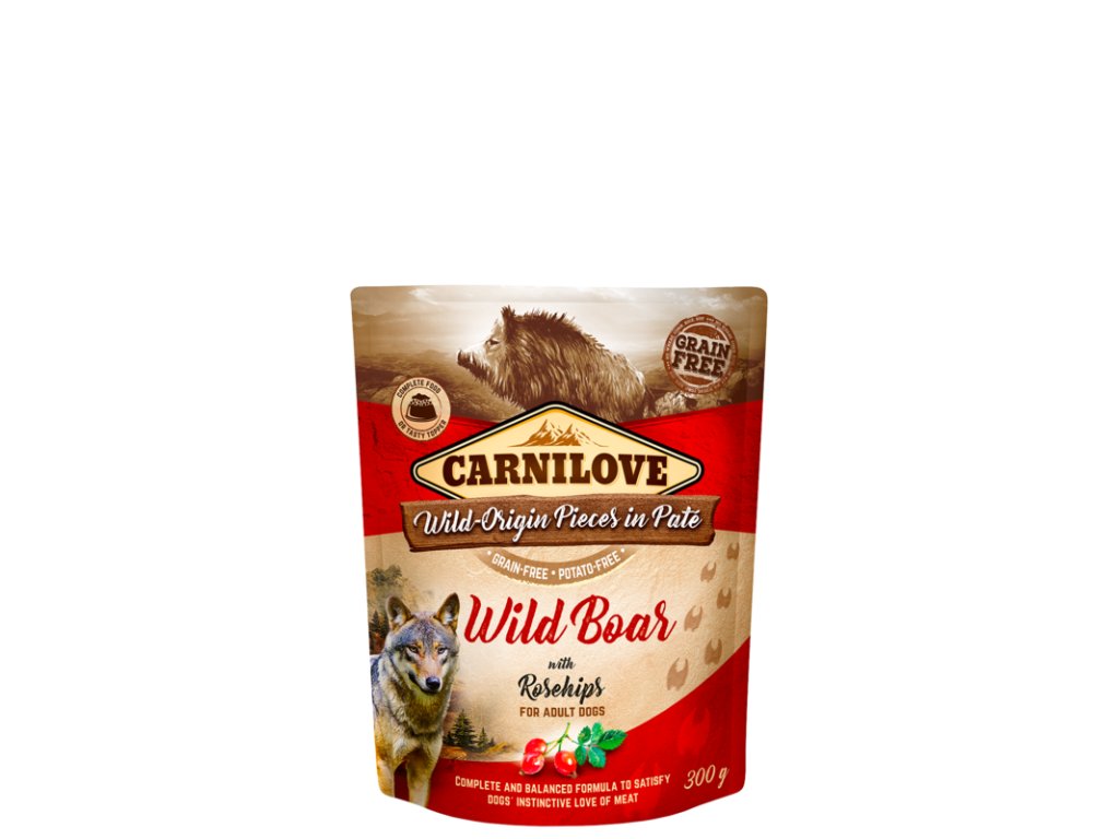 Carnilove Dog Pouch Paté Wild Boar with Rosehips - Šťavnatá paštika z divočáka se šípky. Vysoký podíl masa a bez obilovin.