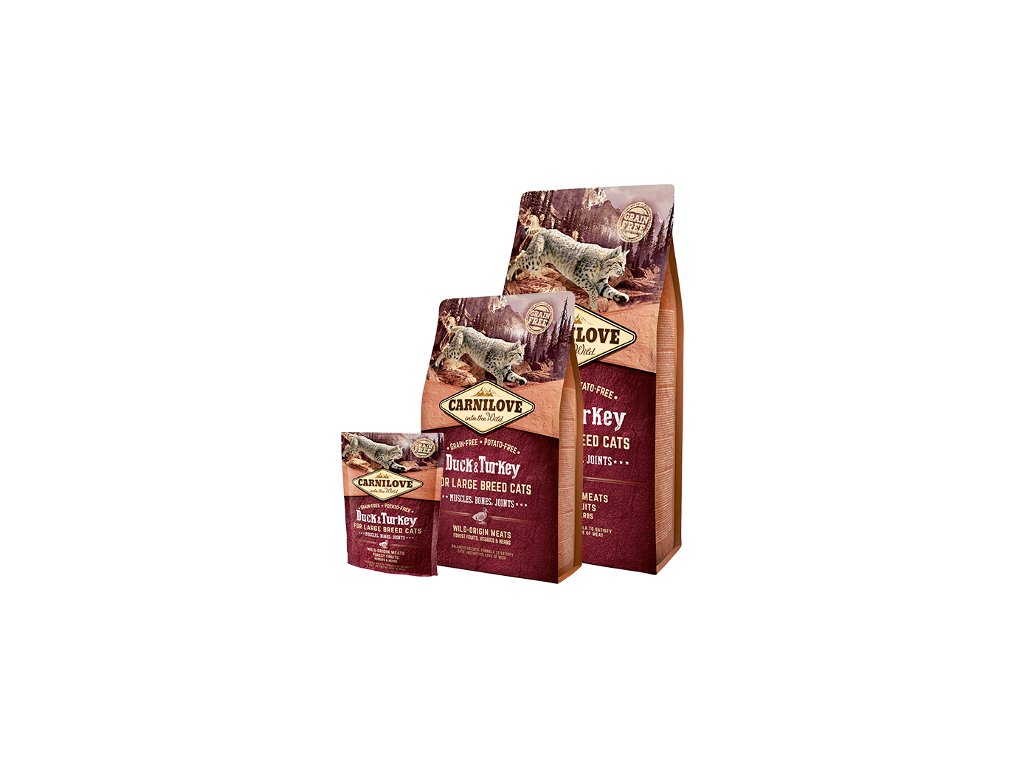 Carnilove Duck & Turkey for Large Breed Cats – Muscles, Bones, Joints - Kompletní superprémiové bezobilné krmivo vytvořené speciálně pro velké kočky. Vysoký obsah živočišných bílkovin z kachny a krůty podporuje rozvoj svalové hmoty, zatímco přidané přírodní chondroprotektivní látky pečují o klouby a pohybový aparát.