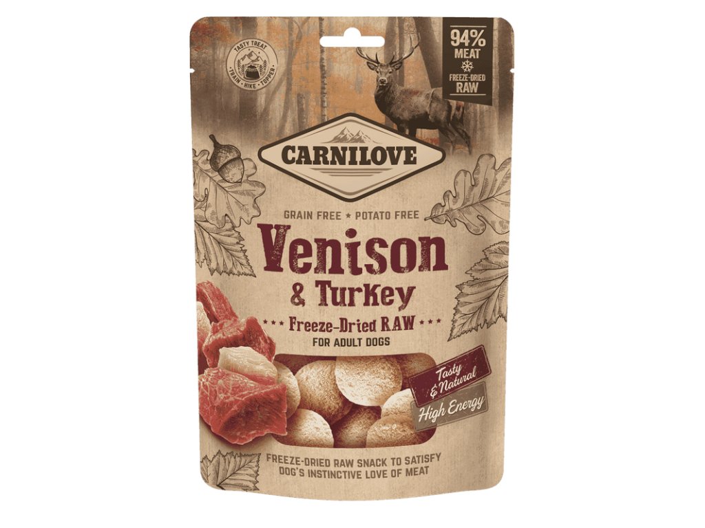 Carnilove Freeze-Dried Raw Snacks Venison & Turkey - Přírodní pamlsek z čerstvé zvěřiny a krůtího masa sušeného mrazem. Díky lyofilizaci si zachovává přirozenou chuť, vůni i živiny. Skvělá volba pro náročné psy, ideální jako odměna nebo motivační pamlsek při tréninku.