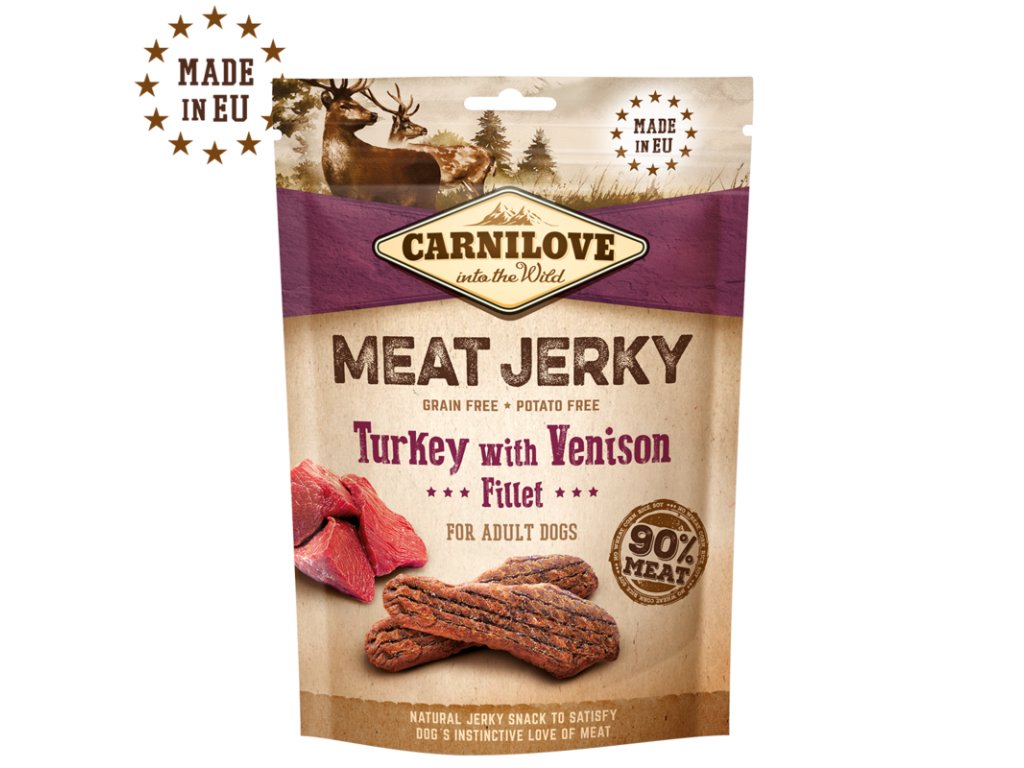 Carnilove Jerky Venison & Turkey Fillet - Poloměkký masový pamlsek s jelením a krůtím masem. Vhodný pro každodenní odměňování psů všech plemen i velikostí.