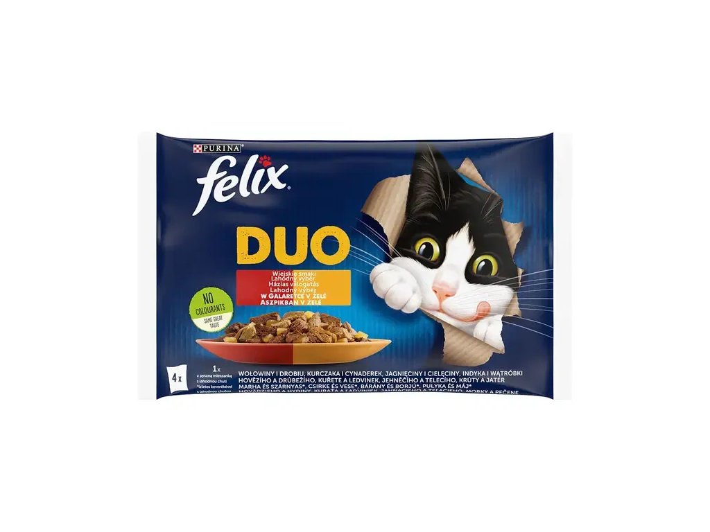 FELIX® Fantastic Duo je řada neodolatelných krmiv, které vypadají, voní a chutnají tak lahodně, jako jídlo, které byste sami uvařili. Každá receptura obsahuje křehké kousky kombinující dvě neodolatelné chutě ve šťavnatém želé. Tak se vaše kočka může do chutného krmiva pořádně zakousnout!