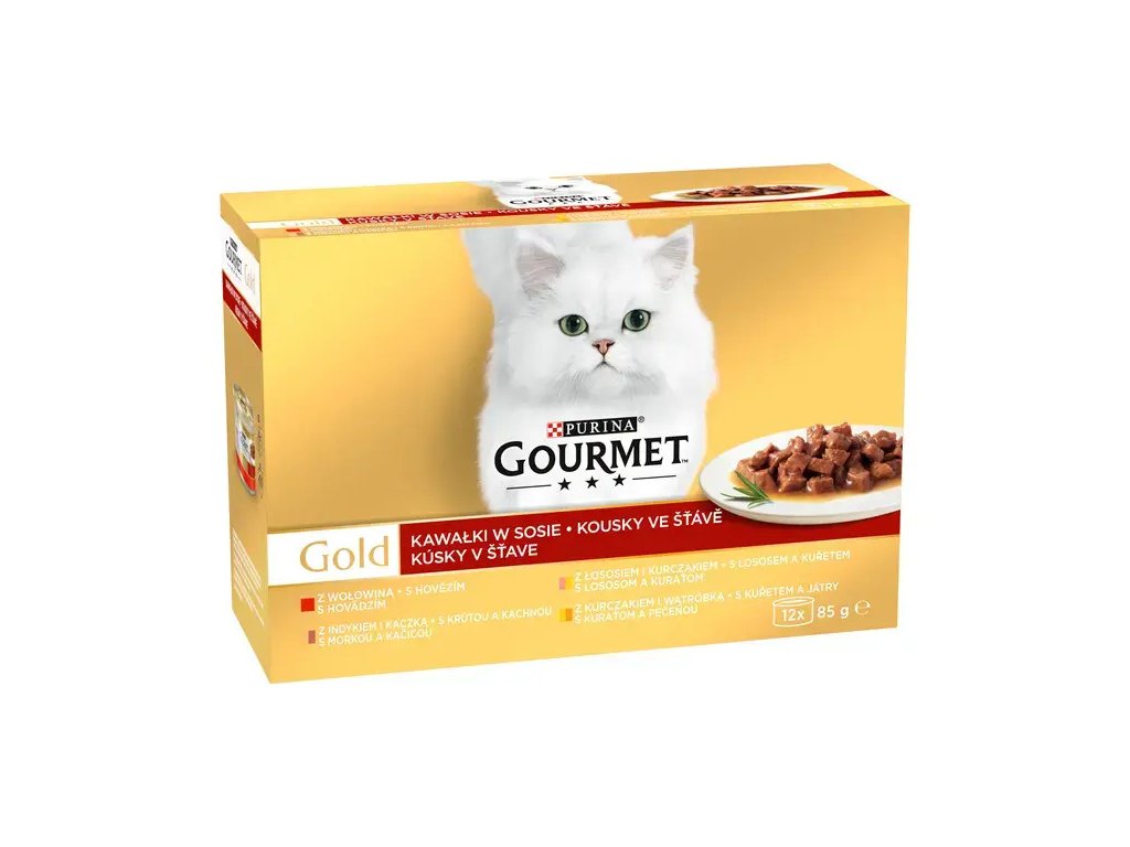 GOURMET GOLD multipack s hovězím, s lososem a kuřete, s krůtou a kachnou, s kuřetem a játry 12x85g