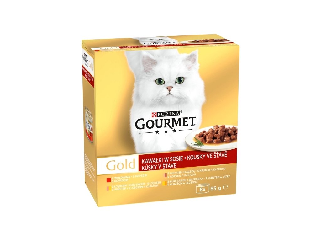 GOURMET GOLD multipack s hovězím, s lososem a kuřetem, s krůtou a kachnou, s kuřetem a játry 8x85g