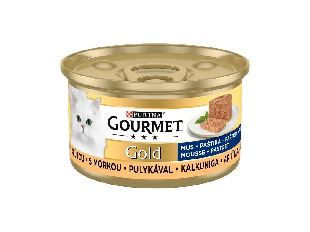 GOURMET™ Gold paštiky: Jemné paštiky s hovězím, kuřetem, lososem a dalšími vynikajícími příchutěmi, pečlivě připravené tak, aby nabídly vaší kočce požitek z delikátní a jemné textury.