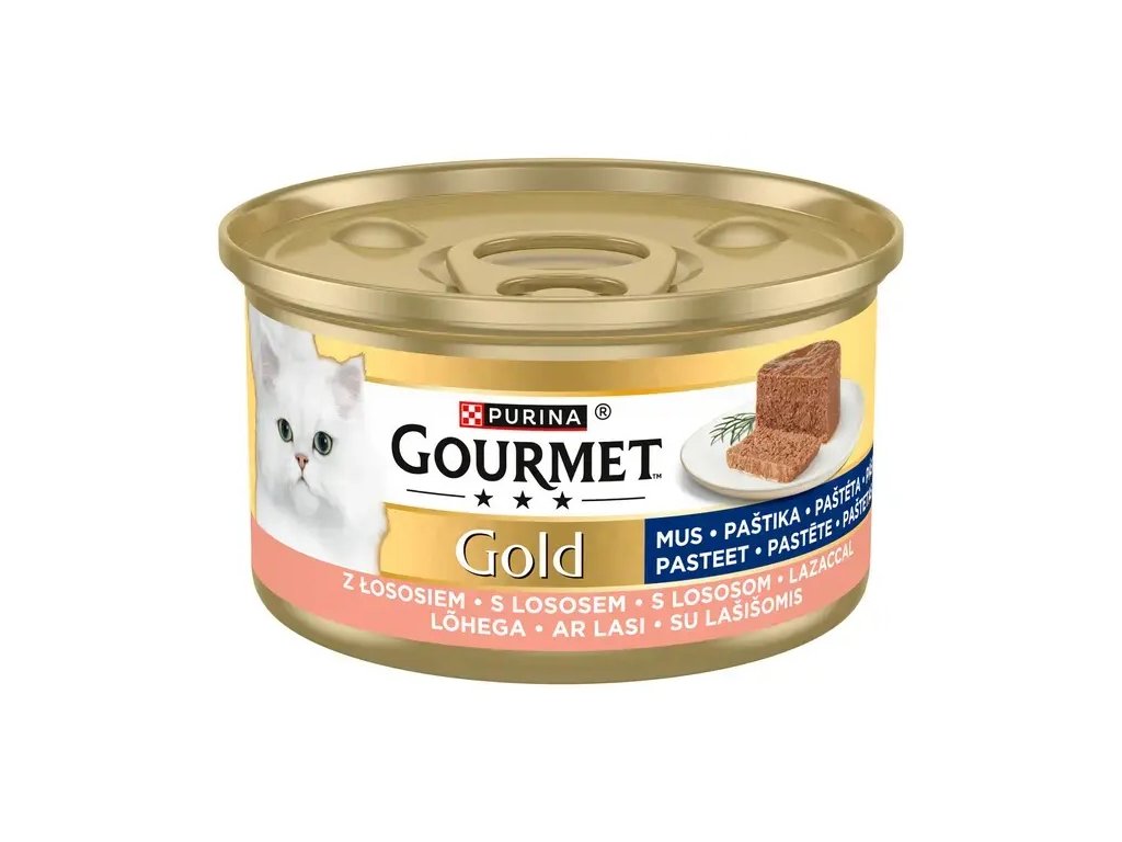 GOURMET™ Gold paštiky: Jemné paštiky s hovězím, kuřetem, lososem a dalšími vynikajícími příchutěmi, pečlivě připravené tak, aby nabídly vaší kočce požitek z delikátní a jemné textury.
