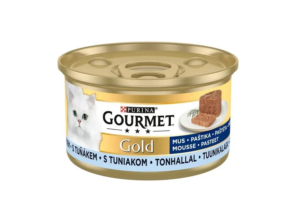 Lahodná a vydatná konzervička Gourmet Gold pro kočky. Obsahuje atraktivní, měkkou a šťavnatou paštiku z chutného masa tuňáků.