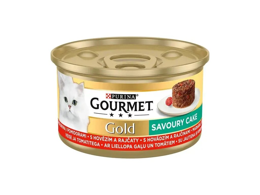 GOURMET Gold Savoury Cake představuje jemně pokrájené kousky s hovězím, kuřetem nebo jinými vytříbenými příchutěmi, pečlivě ochucené jen špetkou omáčky. To vše se snoubí v lahodný dortík a vaše kočka si tak může vychutnat každé sousto.