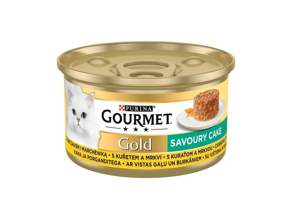 Konzerva Gourmet Gold Savoury Cake je lahodný masový dortík. Obsahuje kuřecí maso a kousky nasládlé a křupavé mrkve.