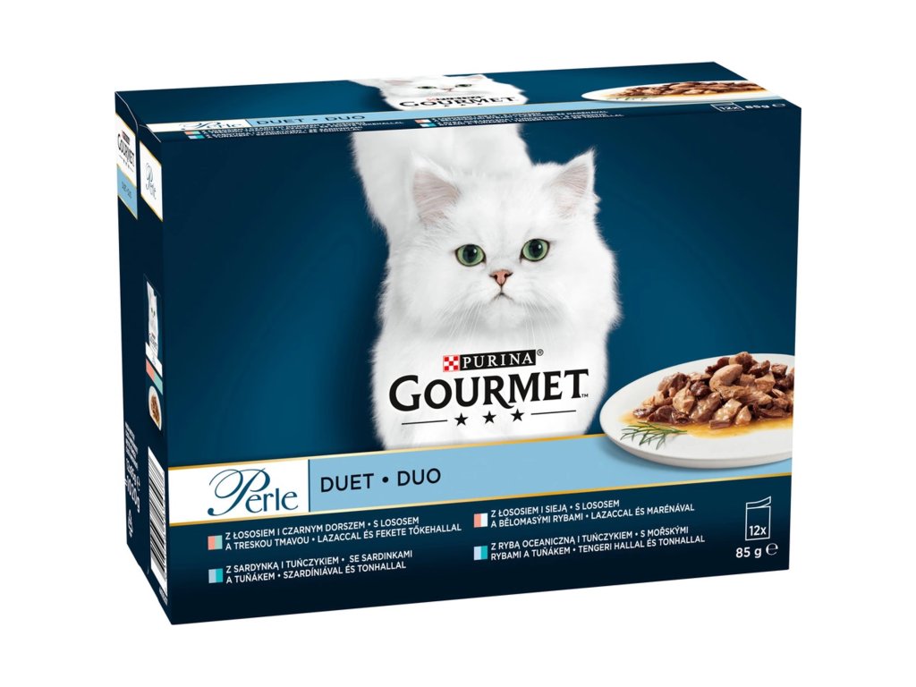 GOURMET PERLE Duo multipack s lososem a treskou, se sardinkami a tuňákem, s lososem a bělomasými rybami, mořskými rybami a tuňákem 12x85g