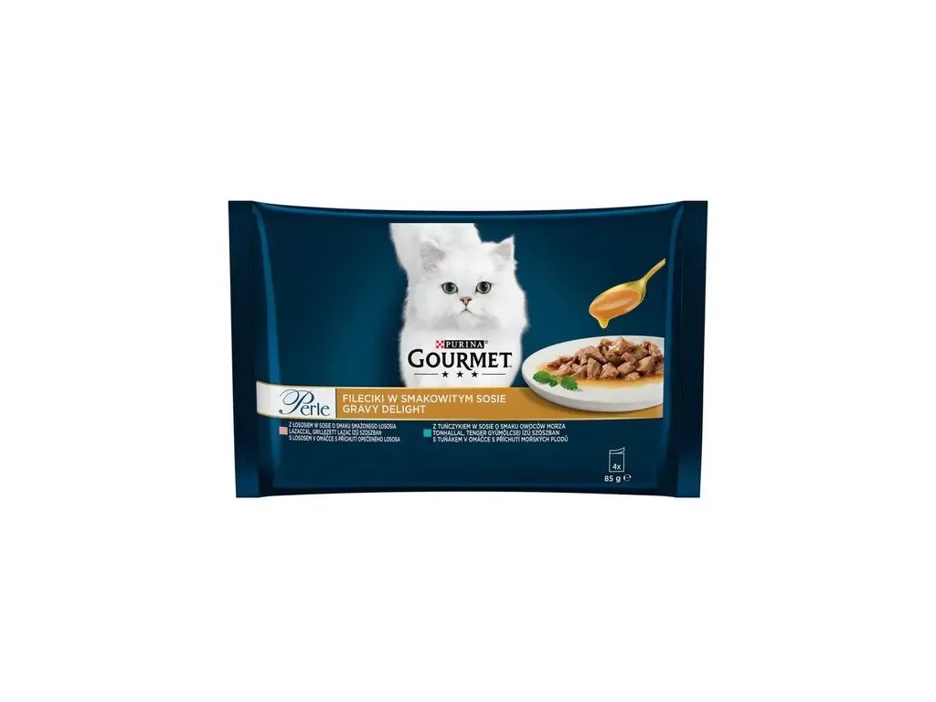 GOURMET PERLE Gravy Delight s lososem v omáčce s příchutí pečeného lososa, s tuňákem v omáčce s příchutí mořských plodů 4x85 g