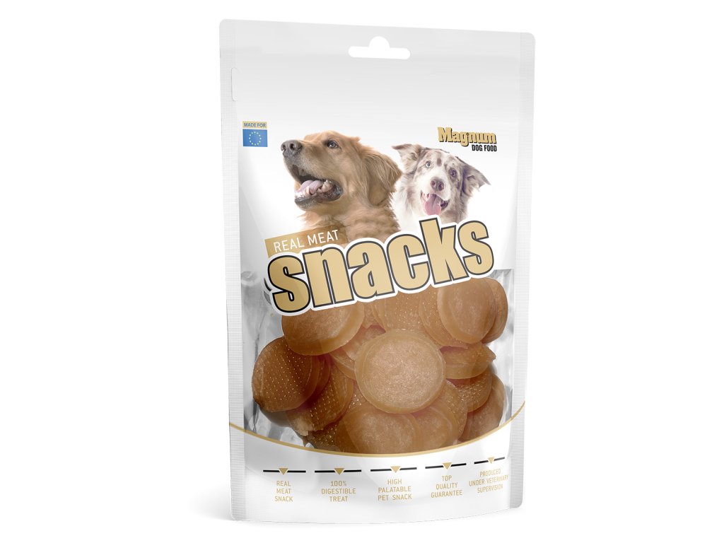 Měkká, přírodní masová pochoutka z kuřecí svaloviny formovaná do malých dukátků - chipsů
