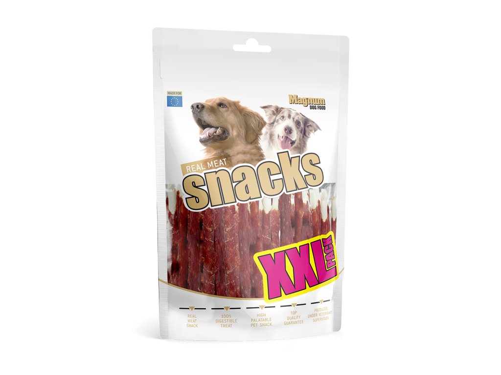 Přírodní masová tyčka z hovězí kůže obtočená plátkem lahodného kachního masa.
