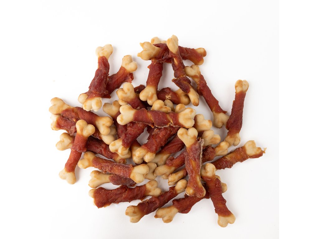 Přírodní masová pochoutka pro psy. Proužek kachní svaloviny namotaný na křupavé kalciové kosti